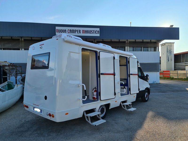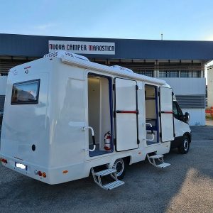 Accessori installati: 3 condizionatori a tetto, 4 piedini di stazionamento elettro idraulici autolivellanti, 2 porte d’entrata con maniglione anti panico, 2 gradini elettrici, 1 locale toilette con wc Nautico e lavabo, Generatore di corrente da 4.0kw , 5 finestre Dometic S4 , Tendalino laterale Thule elettrico, 2 poltrone elettriche multiuso, sospensioni ad aria con compressore, frigo Fiocchetti per medicale, stanza amministrativa con Pc Touch , armadio Rack , Antenna internet Wi Fi, autoradio, portatutto posteriore con baule porta oggetti realizzato su misura, lampeggianti esterni.