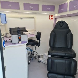 Veicolo Speciale uso Ambulatorio Mobile. Il veicolo è stato suddiviso in 2 Stanze operative per visite, 1 stanza amministrativa e 1 locale Toilette comunicante con le 2 Stanze operative.